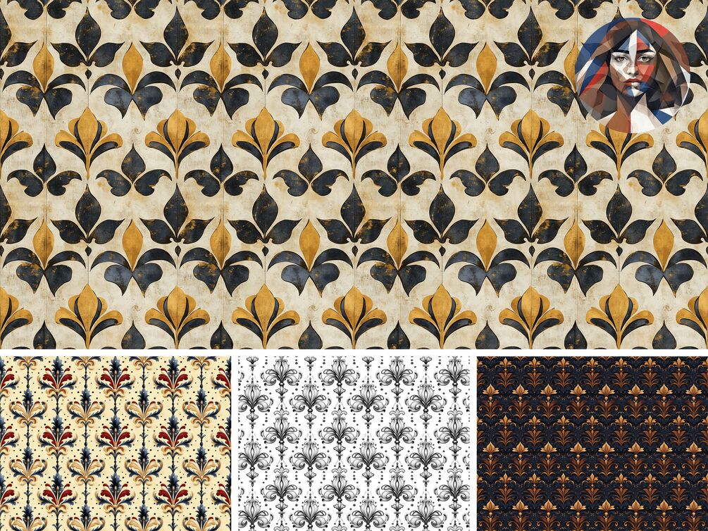 Seamless digital paper files featuring fleur de lys patterns inspired by Mediterranean and Greek colors and shapes.
