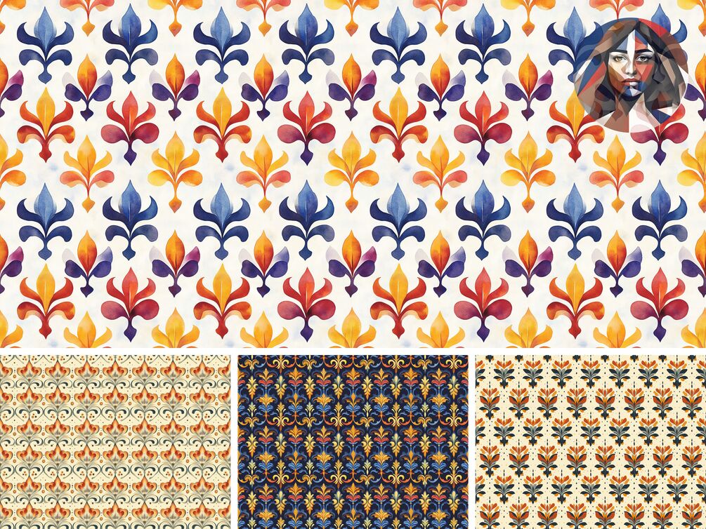 Seamless digital paper files featuring a fusion of retro, midcentury, and technicolor styles with traditional fleur de lys designs.